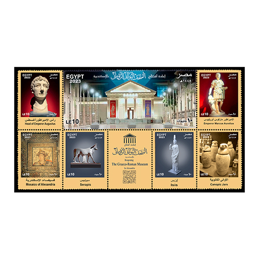 أصدرت الهيئةُ القوميةُ للبريد ميني شيت تذكاري من مجموعة طوابع، بمناسبة الاحتفال بإعادة افتتاح المتحف اليوناني الروماني، بعد إغلاق دام 17عامًا. بدَّأ مشروع تطوير المتحف في عام 2018، وأشتمل المشروع ترميم المبنى الأصلي للمتحف، الذي تم بناؤه في عام 1895 وتجديد معارضه، بالإضافة إلى متحف للأطفال. التصميم عبارة عن ميني شيت مكون من مجموعة طوابع تذكارية، يتصدرها الطابع الرئيسي للواجهة الرئيسية للمتحف الروماني من الأمام، بالإضافة إلى صور تُصوَّر أهم المعالم الداخلية للمتحف، المواصفات الفنية