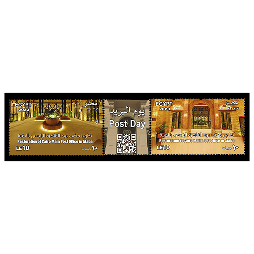 This year, the stamp design expresses: "Set of two stamps, the first one is an image for the entrance of Cairo Main Post Office, and the second stamp is an image for the office after its restoration.