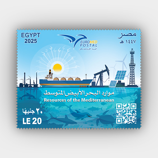 Egypt Post has issued a commemorative stamp of the Euro-Mediterranean Union's competition, titled "Mediterranean Resources." The Mediterranean region is rich in diverse natural and economic resources, including fisheries, oil, natural gas, salt, and other resources. This is in addition to the region's significant tourism importance. Therefore, the Postal Union of the Mediterranean organizes an annual competition among the Union's countries to select the best design for the year's issue. The designs are published on the Union's website, and voting is then held on the best participating designs.