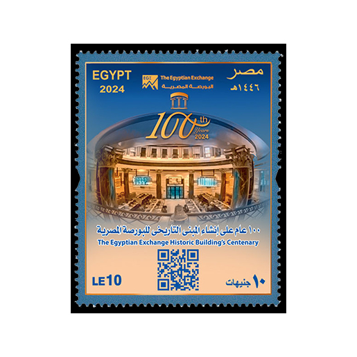 Egypt Post issues a commemorative postage stamp on the occasion of the Egyptian Exchange historic building centenary, as a symbol of Egypt's economic prosperity throughout the ages, privileged by its architectural beauty and unique design, thus making it a prominent landmark in the heart of Cairo.